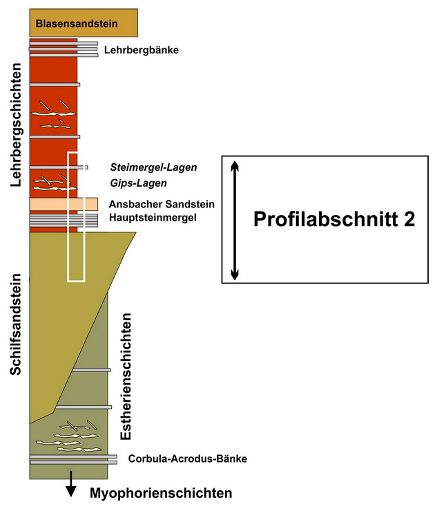Der Profilabschnitt 2 erfasst den oberen Bereich des Schilfsandsteins. sowie die darüber folgenden