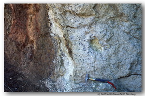 im bräunlich verwittertem Suevit Stbr. Aumühle. Rechts: Hammerkeil als Maßstab