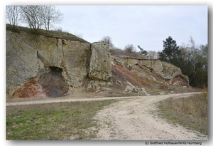 Ein großer Teil des einst in Nördlingen verbauten Suevits stammt aus dem Steinbruch an der Alten Bürg. Hier grenzt der Suevit