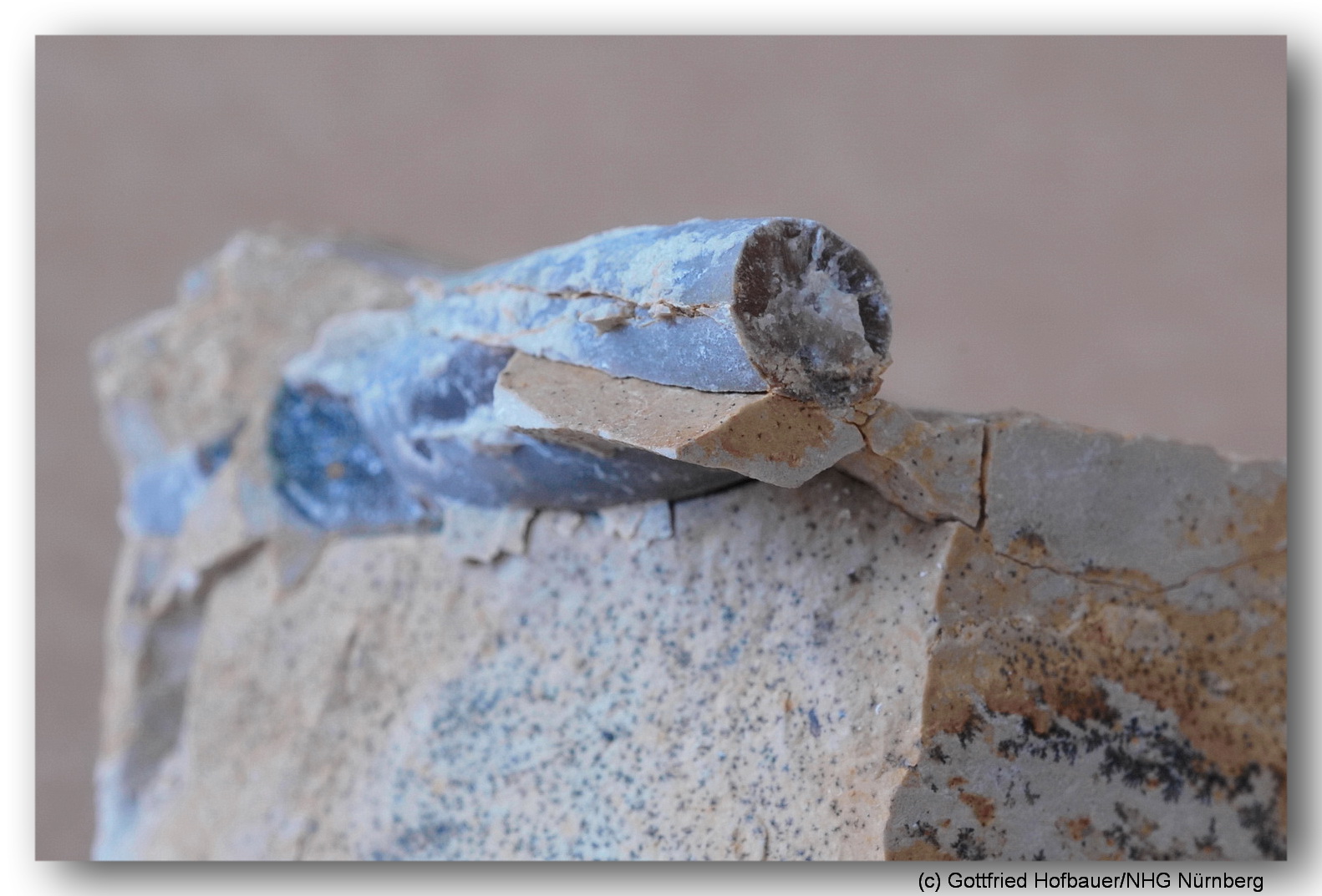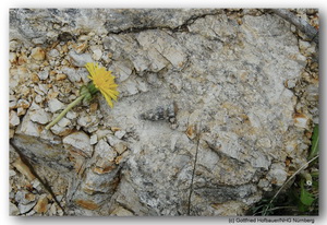 Die Zerscherung erzeugte auch die berühmten "zerhackt versetzten" Belemniten-Rostren (Bildmitte rechts unterhalb der Blüte).